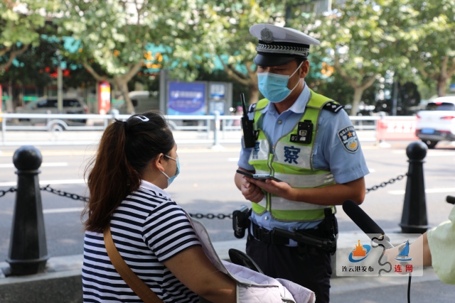 上午9点30分,在市区海昌路朝阳路口,市交警支队海州二大队正在对行人非机动车违法行为进行严查。一名女性骑电动自行车由北向东逆行被民警拦下,在经过民警一番教育后,她认识到自己的交通违法行为,表示今后会遵守交通规则。