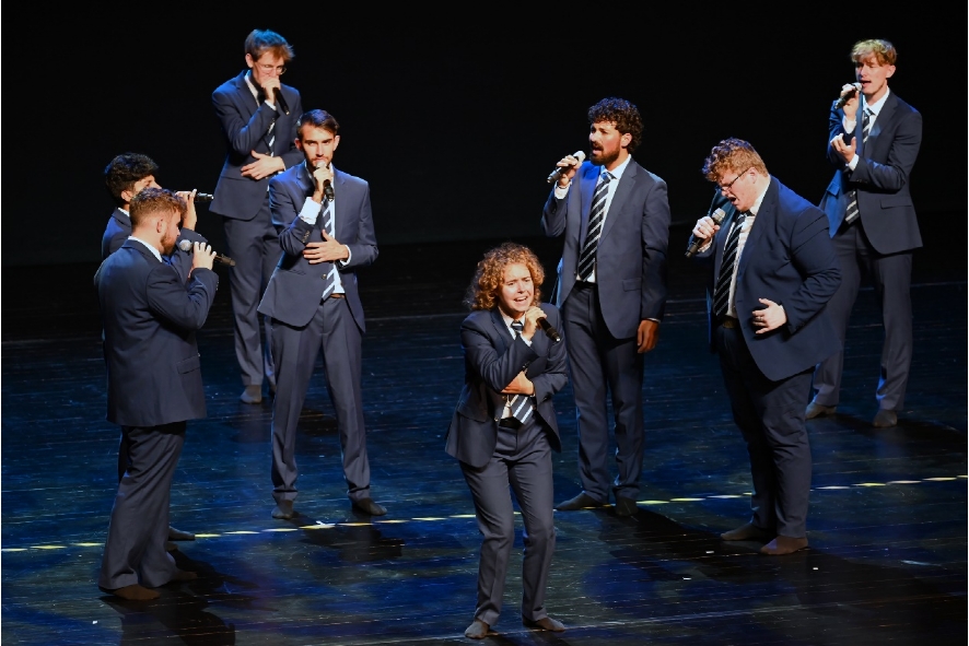 9月19日19:30,连云港保利大剧院大剧场内座无虚席,英国牛津大学 OUT OF THE BLUE 阿卡贝拉合唱团登台亮相,为港城观众带来剧院史上首场阿卡贝拉音乐会。随着人声版《冰雪奇缘组曲》的旋律响起,现场观众不时跟随节奏轻晃身体,演出间隙的掌声持续近 1 分钟。本场演出中,本地合唱团成员与牛津学霸同台演唱《月亮代表我的心》,完成合唱首秀的参与者在谢幕时向舞台侧方挥手致意。
