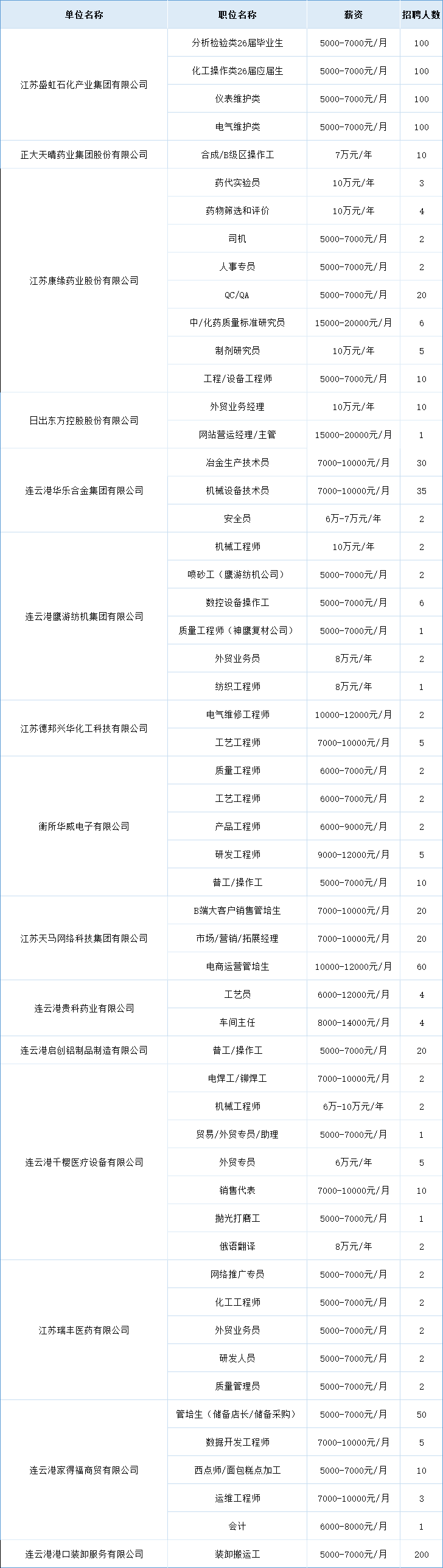 九月的风 带着初秋的微凉 正是找工作的好机会 秋季规模最大的招聘会来啦 快带上简历 找寻您的专属岗位吧! 金风送爽,丹桂飘香。“就”在金秋“职”面未来金秋招聘月大型招聘会来了,百家企业准备就绪,助你成就职场梦。欢迎广大求职者积极进场洽谈,寻找自己心仪的工作。穿越人海,我们在市人力资源市场“职”为与你相见! 一、活动时间 线下:9月26日(周五)8:30—12:00 抖音直播:9:00-11:00(“就在港城”抖音号) 二、活动地点 连云港市人力资源市场(海州区花果山大道19号) 三、举办单位 主办单位:连云港市人力资源和社会保障局、连云港市商务局、连云港市退役军人事务局、连云港市残疾人联合会 承办单位:连云港市劳动就业管理处、各区人力资源和社会保障局 协办单位:连云港市电子商务协会 四、参会方式 求职者可到现场咨询、洽谈、选择心仪的岗位,也可通过“苏心聘”小程序,“就在港城”抖音直播间了解更多招聘信息。 咨询电话:0518-85685911 “苏心聘”微信小程序 “就在港城”抖音号 重点招聘企业介绍 江苏康缘药业股份有限公司 江苏康缘药业股份有限公司是一家致力于中药研发、生产、销售于一体的中药现代化、国际化、智能化大型企业,国家重点高新技术企业,国家技术创新示范企业,国家创新型试点企业,国内A股上市公司,中国制药工业百强企业,连续多年位居“中国中药研发实力排行榜”第一。 公司坚持“创新驱动”的发展战略,目前建有中药制药过程控制与智能制造技术全国重点实验室、中成药智能制造国家地方联合工程研究中心、国家博士后科研工作站等国家级科研平台。构建“产学研”协同创新机制,与南京中医药大学、中国科学院上海药物研究所、沈阳药科大学等共建研究中心/平台,与各类科研院所、高校强化推进协同创新。 公司以中医药发展为主体,并积极布局化学药、生物药等领域,形成了妇科、抗病毒感染、骨科、心脑血管等多领域、多品种格局,打造了热毒宁注射液、金振口服液、银杏二萜内酯葡胺注射液、桂枝茯苓胶囊、杏贝止咳颗粒等一大批核心产品群。 公司研发实力连续多年位列全国中药行业首位,拥有中药新药59个,累获发明专利授权742件;承担973计划、863计划、国际合作、重大新药创制、科技成果转化等国家级以上重大科技项目40项;获国家技术发明二等奖1项、国家科技进步二等奖3项、中国专利金奖2项,桂枝茯苓胶囊已完成美国FDAⅡ期临床试验,是我国中药行业拥有新药证书最多、承担国家重大科研项目最多、拥有发明专利最多、推进国际化最深入的企业。 优厚的薪酬:绩效考核奖金、特殊岗位津贴、年终奖、各类补充性奖金等。 个人福利:六险一金、带薪年假、住房补贴、夜班补贴、节日福利、各类员工活动等。 健康关怀:年度健康体检、员工关爱基金。 食宿安排:上下班通勤车、免费工作餐、员工宿舍及人才公寓。 科学的职业生涯规划:管理和技术双通道发展(职级晋升通道:员工、主管、经理、总监、副总;专业技术通道:员级、助理级、中级、高级、资深)等。 系统的培训体系:陪伴职业生涯终身的培训,如岗前培训、专业提升培训、管理技能提升培训等。 连云港港口装卸服务有限公司 连云港港口装卸服务有限公司,成立于1989年05月23日。为连云港港口集团全资子公司。 公司注册地位于连云港市连云区陶庵庙岭社区桃林路12号,经营范围:港口货物装卸搬运活动;劳务派遣服务。 公司在册员工超2000人,业务覆盖“一体两翼”各码头公司。现设有5个职能部门和10个装卸分公司,分别服务于连云港港口 集团9个码头公司,从公司到各分公司组织架构完善。在服务的各码头用工单位设置了固定的劳务作业队伍,提供的劳务承包业务能够让各码头公司更专注于本身的核心竞争力,使企业能够集中精力发展生产经营,参与市场竞争。公司在连云港港口集团装卸服务板块居于各劳务单位前列。 招聘岗位抢先看(部分) 转发给身边找工作的朋友!