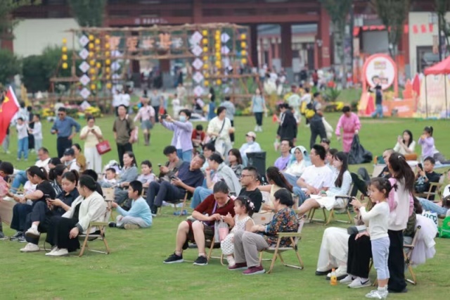 多元体验活动还精心打造了多元消费场景,满足全年龄段游客需求。北草坪区域,特色餐饮与国风市集汇聚,游客可以品尝菊花糕点、茗茶,体验手作乐趣。南草坪的儿童游乐区,草地足球、骑马等项目充满欢声笑语。同时,景区常态化的考古探方、丛林穿越、文创商店等消费业态也全部开放,形成了集“游、赏、玩、购、品”于一体的完整消费链条。
