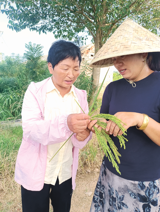 初秋的风吹过无边的稻田,漾起层层绿浪。徐凤珍蹲在田埂上,正手把手教几个年轻农民识别稻瘟病的早期症状。