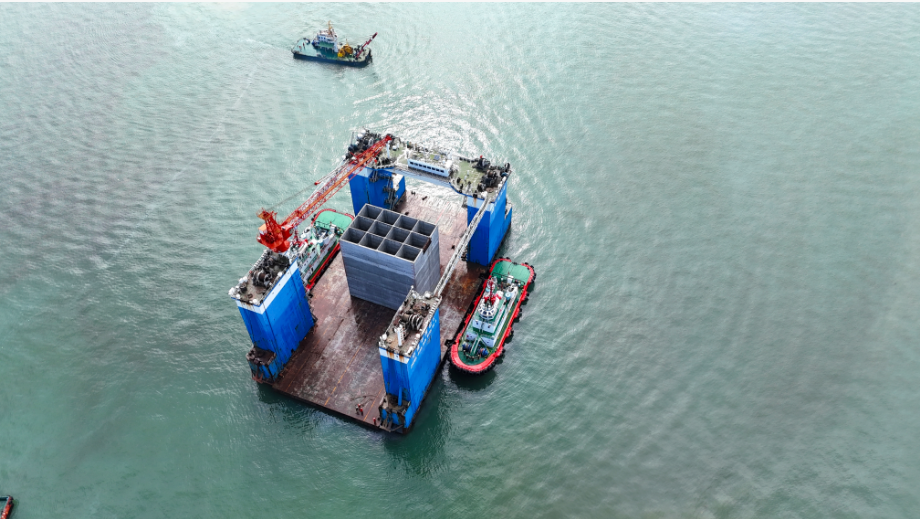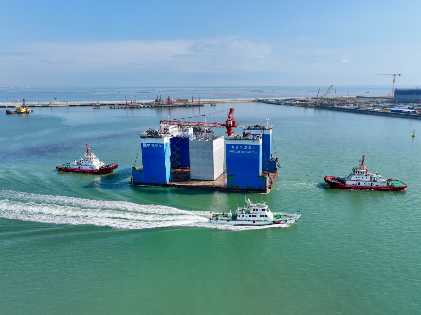 此次服务中,拖轮拖带8000吨举力半潜驳船,将码头主体结构关键构件沉箱安全运送至码头施工项目现场,其中单件沉箱最大重量达2799吨,为此次作业带来不小挑战。