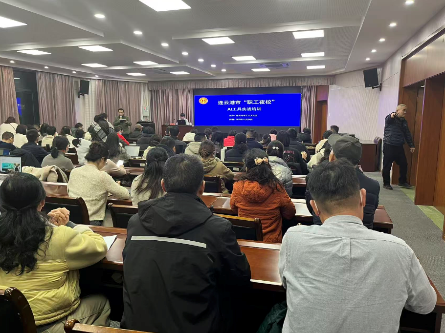 数字化转型背景下,职工对数字技能提升的需求日益迫切。11月24日晚,连云港市工人文化宫职工夜校AI工具实战培训课程率先开课,以“理论讲解+案例分析+实操演练”的实战模式,聚焦文档处理、数据统计、高效沟通等办公核心场景,手把手传授AI工具实用技巧。培训现场座无虚席,学习氛围浓厚,学员覆盖制造、科技、医药、新能源、纺织等多个行业,政企人员占比超半数。“白天上班没时间学,夜校把课程送到家门口,还能直接用到工作中,太实用了!” 一位企业职工学员表示。夜校模式有效缓解了在职职工 “工学矛盾”,也直观反映出职工对数字技能提升的强烈诉求。