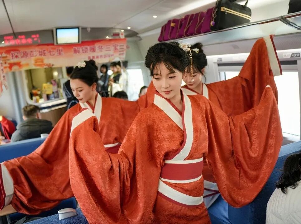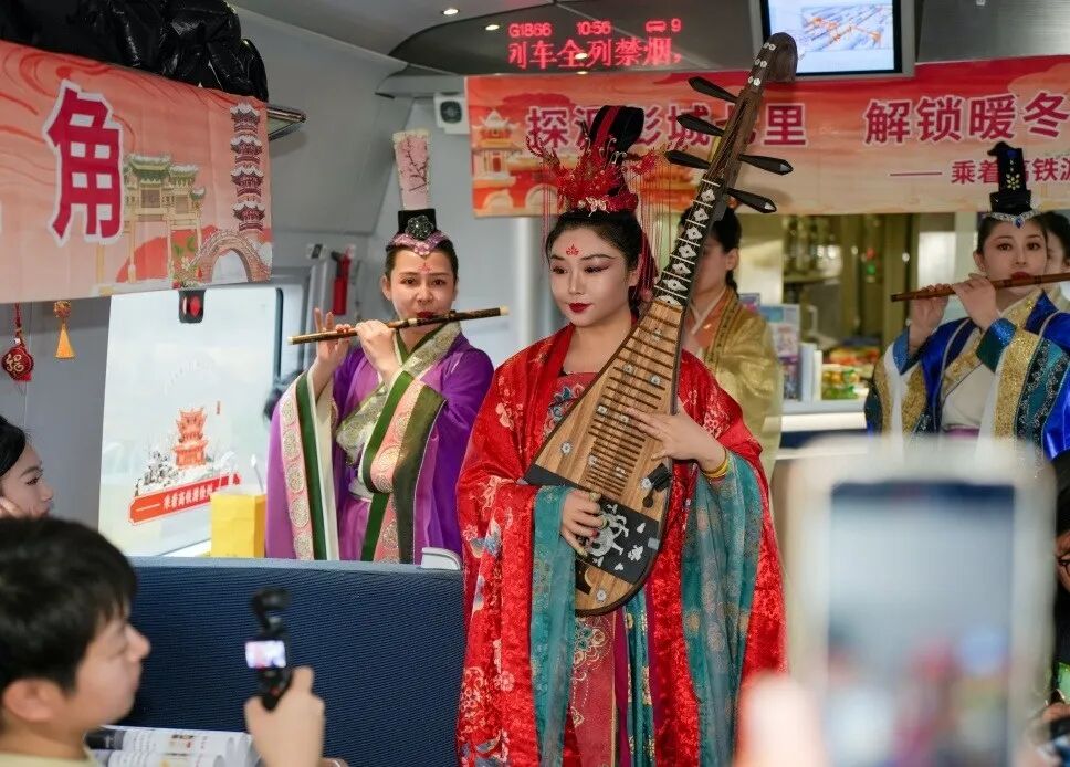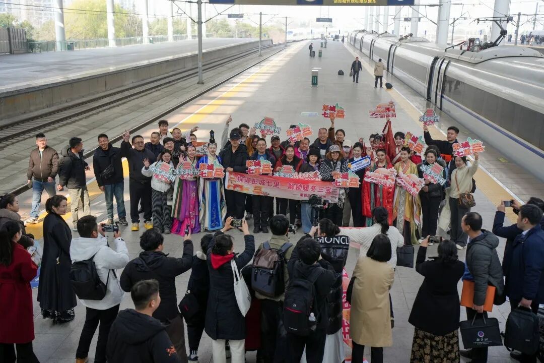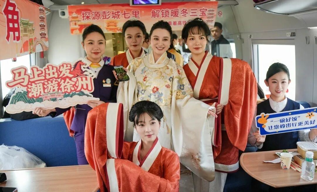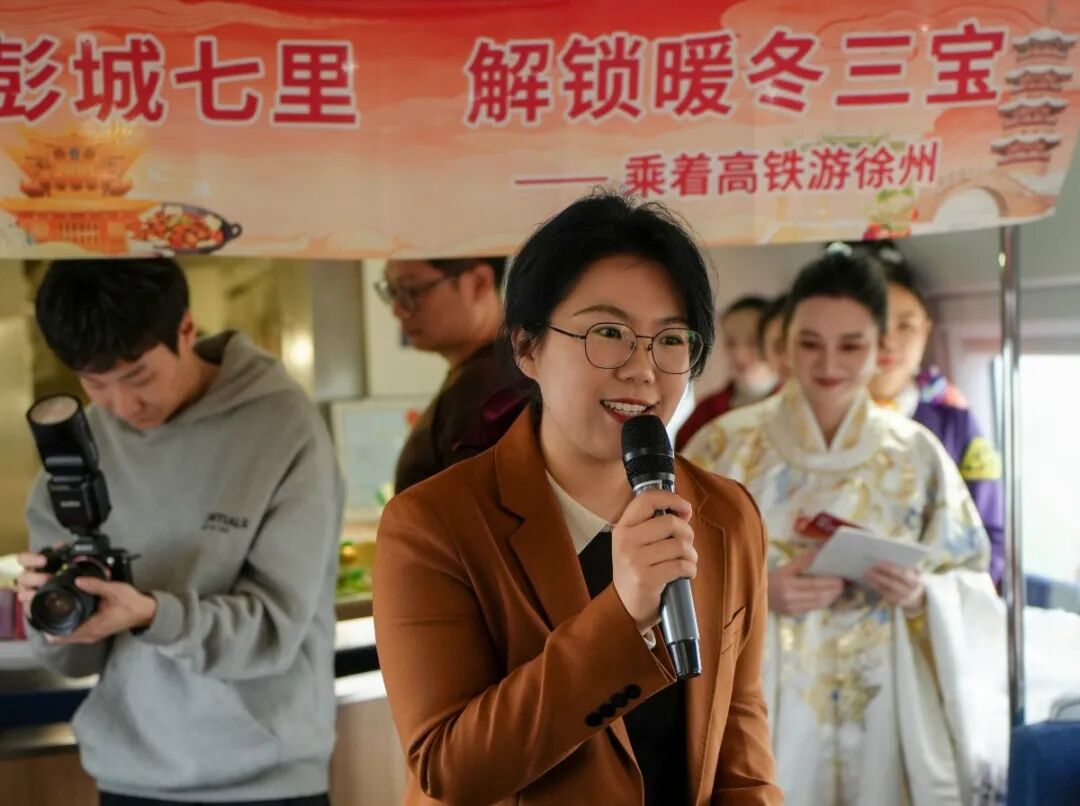 12月19日上午 从南京开往徐州的G1866次列车餐车上 一场热气腾腾的文旅推介正在上演 探源彭城七里 解锁暖冬三宝 “乘着高铁游徐州”文旅宣传推介活动 在羊肉水饺的香气与悠扬汉乐中 拉开帷幕 来自中央及省级主流媒体、长三角与苏皖鲁豫交界地区18市报业广电媒体、重点旅游城市文旅企业代表等数十人齐聚车厢,开启为期两天的徐州暖冬体验之旅,沉浸式感受徐州美景美食,向全国推荐徐州独具魅力的冬季文旅资源。 推介 冬日徐州游,把欢乐拉满 “乘着高铁游徐州”宣传推广活动是“五省通衢”的徐州发挥铁路枢纽优势,联合上铁集团共同推出的“铁路+文旅”融合创新举措。活动旨在通过文旅赋能,以铁路运输为游客提供移动的文化旅游空间和沉浸式旅行体验,培育打造以铁路为纽带的旅游目的地、始发地。 徐州文旅推介官向餐车上的旅客重点推介了“彭城七里”历史文脉与徐州“暖冬三宝”(滑雪、草莓、贾汪炒鸡)等特色冬季文旅资源,展现徐州“历史人文+冰雪运动+非遗美食”的多元魅力。 徐州3.5公里长的城市文脉——彭城七里,是徐州深厚的文化底蕴和烟火生活的写照,北起黄河故道,南至云龙山,浓缩了徐州千年岁月。 徐州“暖冬三宝”即“冰雪三件套”,第一件套是驰骋冰雪的激情,第二件套是亲手采摘的甜蜜,第三件套是点燃味蕾的豪迈。滑雪、采摘,品美食,“暖冬三宝”把快乐拉满。 在推介活动中,江苏省柳琴剧院四位专业演员现场演奏经典曲目,三位高铁乘务员身着汉服翩然起舞。车厢内,车窗贴着徐州戏马台等彭城七里景观的活动主题标识,座位上也展示了各色马庄香包与文旅宣传册页,历史文化名城的魅力在每一个细节中绽放。 徐州市文广旅局总工程师王莹介绍,新年临近,徐州文旅推出了丰富的冬季旅游精品线路与136项元旦跨年文旅活动,欢迎各地游客把假期目的地定在徐州,在这里度过一个有趣又丰富的冬季之旅。 互动 冬至的饺子,徐州的温度 距离12月21日冬至还有两天。作为中国传统节气的重要节点,冬至不仅意味着一年中最寒冷时节的开始,更承载着“冬至大如年”的民俗意蕴。在G1866次高铁列车上,餐车推出了冬至特别供应的“徐州特色羊肉水饺”。这是徐州文旅联合铁路部门推出的暖心服务,让途经徐州的旅客在旅途中也能品尝到地道徐州味。 “徐州老话讲‘夏吃伏羊,冬吃暖羊’,冬至这天吃羊肉饺子、喝羊汤,一冬天都不怕冷”,在推介官的娓娓道来中,乘客们纷纷品尝。从南京上车的潘女士感慨:“没想到高铁上能吃到这么有地方特色的饺子,一口下去暖洋洋。” 此外,徐州“老八样”糕点、新摘的贾汪草莓也受到旅客们的点赞。马庄香包非遗体验、有奖问答等活动互动踊跃。答对问题的旅客获得了徐州饮食文化博物馆“银票”、苏徐州暖食盒等惊喜好礼。 一个半小时的快乐行程让大家意犹未尽。抵达徐州东站后,接下来的行程,受邀媒体人和文旅企业代表们将实地体验徐州,领略“暖冬三宝”主题线路以及“彭城七里”文脉线路,用脚步丈量徐州“冰雪运动+历史人文+美食休闲”的多元魅力。 媒体与旅行社代表纷纷表示,将把这次对徐州的美好体验分享出去,吸引更多游客共赴“冬季潮游徐州”之约。南京梅山国旅总经理陈兵说:“非常开心参加徐州文旅活动,期待带更多游客来徐州,畅游这座有温度的城市。”