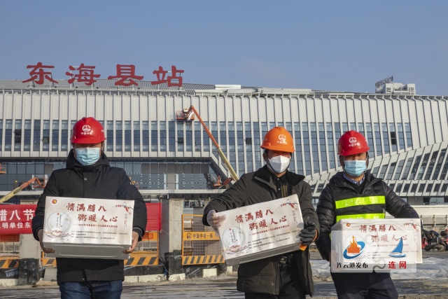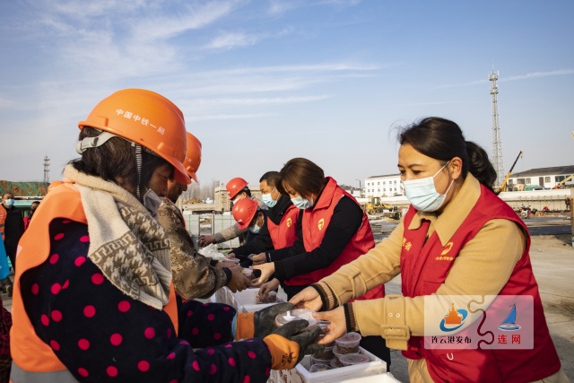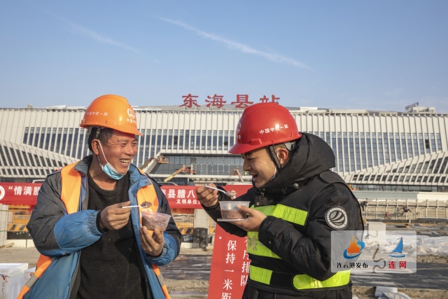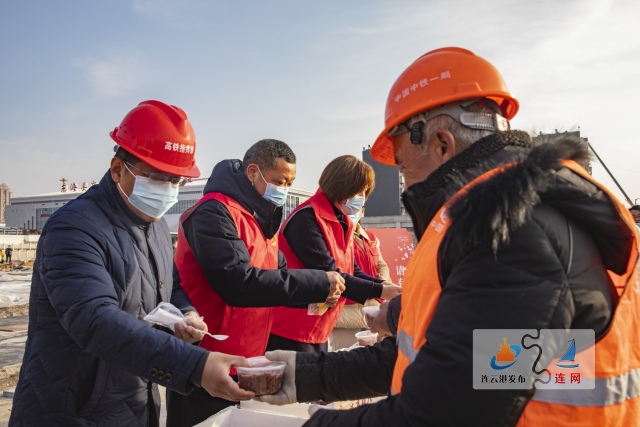 1月20日,农历腊月初八“腊八节”。 一大早,徐连高铁东海县站建设工地上的工人们就喝上了志愿者们送上的腊八粥。当日,该县爱心帮扶协会组织志愿者,挑选了香米、莲子、桂圆、红豆、花生、核桃、薏仁、红枣等10多种食材,由专业厨师精心熬制了腊八粥,将500余份腊八粥送到了一线建设工地,感谢他们为城市建设做出的贡献,也让许多外地的建设者们感受到了城市的温暖。据了解,徐连高铁预计2月上旬通车,工程建设者们顶着寒风,奋战在建设一线,抢工期、赶进度,保障高铁顺利开通。记者 张泽瑞 通讯员 柴军委 孙元瑞 摄