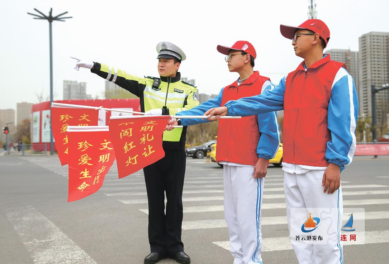 3月29日,市公安局交警支队连云大队开展“争做文明交通志愿者”主题活动。东港中学学生在街头与执勤民警一同维护交通秩序,劝导路人和非机动车驾驶人按照红绿灯指示通行。当天是第26个“全国中小学生安全教育日”,今年的主题是“知危险,会避险,守护安全成长”。记者王健民通讯员李治摄影报道