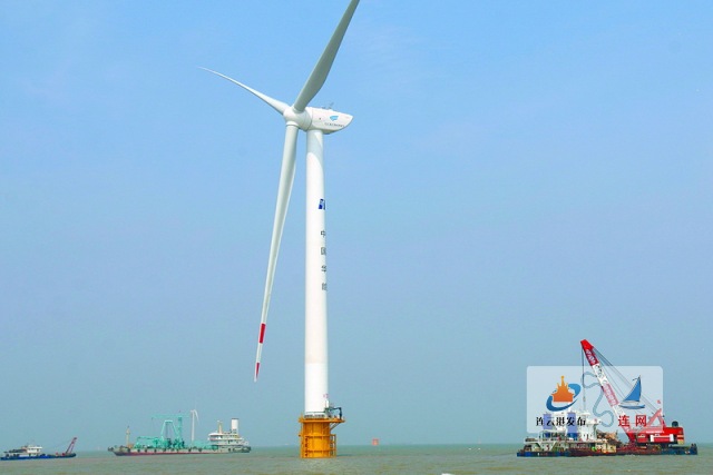 昨日,灌云县燕尾港海域,施工人员在海上实施风电安装作业。该项目是国内首个旋转流潮汐海域风电项目,作为全国单机容量最大海上风电场项目,施工单位攻克了施工区域海床淤泥厚、220千伏海缆穿堤定向施工、国内首次171机组坐滩施工等技术难题,为未来旋转流潮汐区域海上风电建设大型机组吊装并网积累了重要经验。据了解,一期项目预计实现年满负荷等效利用小时2724小时,年发电量达8.26亿千瓦时,每年可节约原煤23万吨。