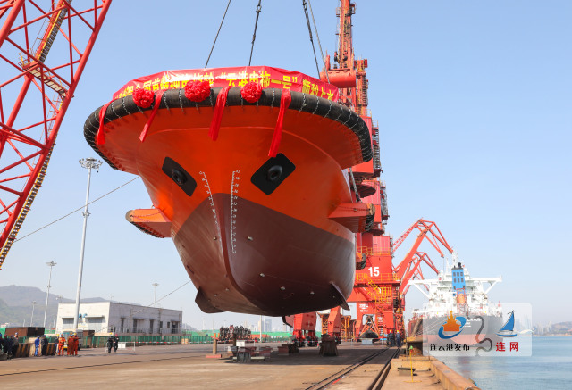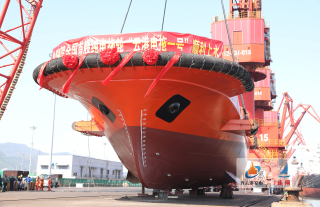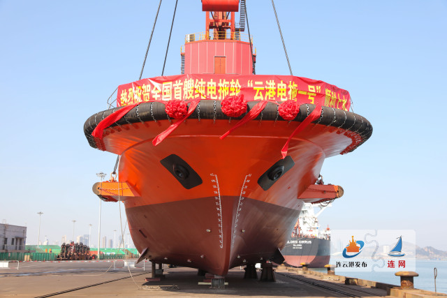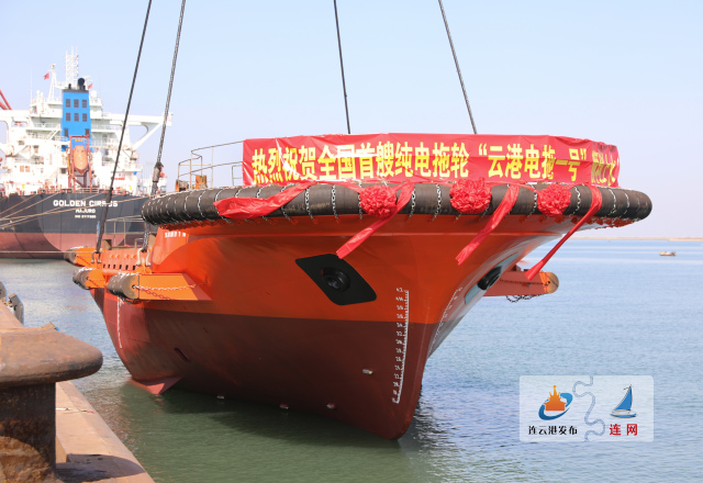 4月14日,由港口控股集团轮驳分公司承建的国内首艘纯电动拖轮“云港电拖一号”轮顺利上水,这标志着我国在拖轮行业技术革新方面迈出了坚实的一步。纯电动拖轮采用磷酸铁锂动力电池组替代常规柴油机组作为主推进动力,不仅安全系数高,还解决了传统柴油机推进的油污染和碳排放问题,具有绿色、环保的特点。该拖轮总长36米,型宽10米,型深4.5米,吃水3.5米。航速不小于13节,工作时长不低于8小时,总电量设计为5000千瓦时,可达到4000马力常规拖轮使用效果。(记者 王健民 通讯员 孙子安 尹靓 摄)