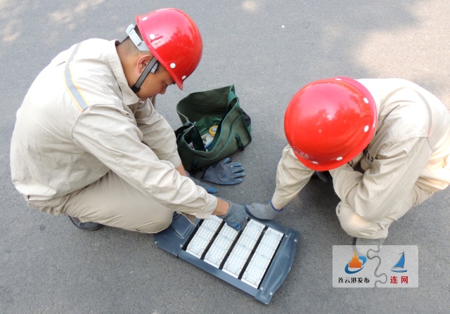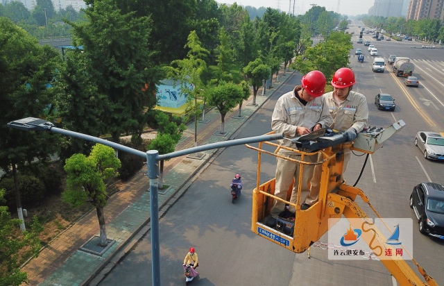 22日,在海州区盐河南路,市城建控股星辰照明公司工作人员正在对传统光源路灯进行更换改造。