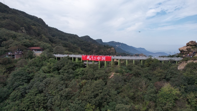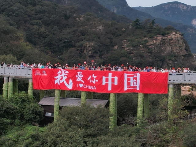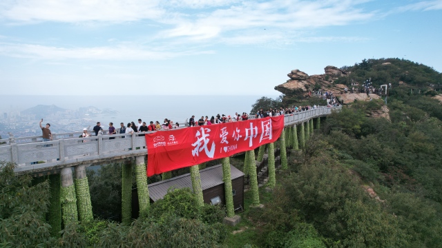 10月1日上午,市民游客来到海上云台山景区,在云顶手持红旗合唱,向伟大祖国表白。 记者 徐黎一 通讯员 李灵通