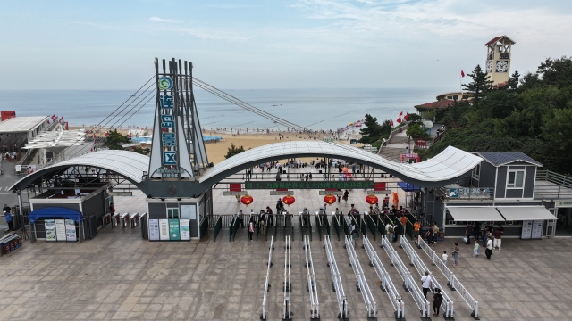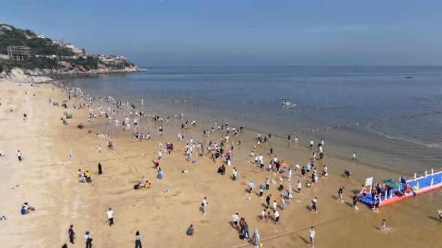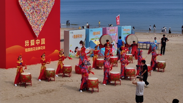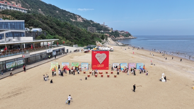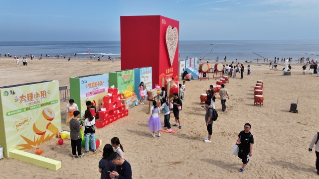 10月1日上午,以山海为背景以快乐为主题,一场国庆海洋奇遇在连岛景区大沙湾举行。活动现场氛围热烈,人们沉浸其中共同为祖国母亲庆生。 记者 徐黎一 通讯员 茆紫瑞 摄影报道