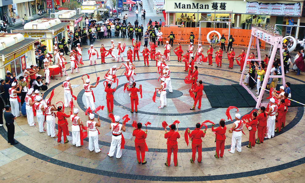 10月1日,海州区文旅部门特邀陕西延安安塞腰鼓队,在陇海商业步行街、盐河巷表演,为国庆佳节增添一份喜庆气氛。