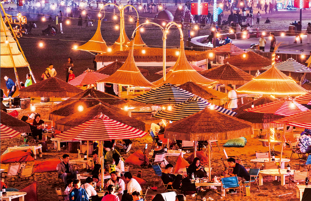 国庆中秋假期,在海一方公园灯光璀璨,网红沙滩夜色多姿多彩,美不胜收。众多游客观海景、吃烧烤,在沙滩上享受惬意的假日时光。