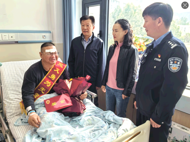 10月18日,在连云港西大堤旁,市民王玉平下海救人的英勇事迹引发社会广泛关注。昨日,市见义勇为基金会工作人员专程到医院慰问因救人而受伤的王玉平,并向他颁发见义勇为奖金。被救人员李龙和妻子在医院看望王玉平时表示,要把这份恩情传承下去,让孩子懂得报恩、懂得感恩。(记者史卫平 通讯员 梁杰摄影报道)