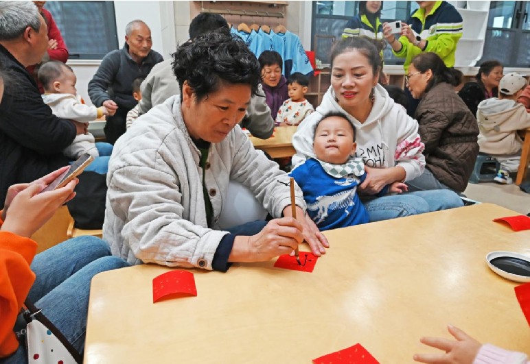 随后,活动进入了“笔墨书福寿”的环节。爷爷奶奶们铺开红纸,研墨挥毫,认真地写下“福”、“寿”、“乐”、“安”、“宁”等饱含美好祝愿的毛笔字。最温馨的一幕是,宝宝们在老师的引导下,和爷爷奶奶一起将这些象征着吉祥的书法作品,亲手贴在一颗颗新鲜的白菜上。