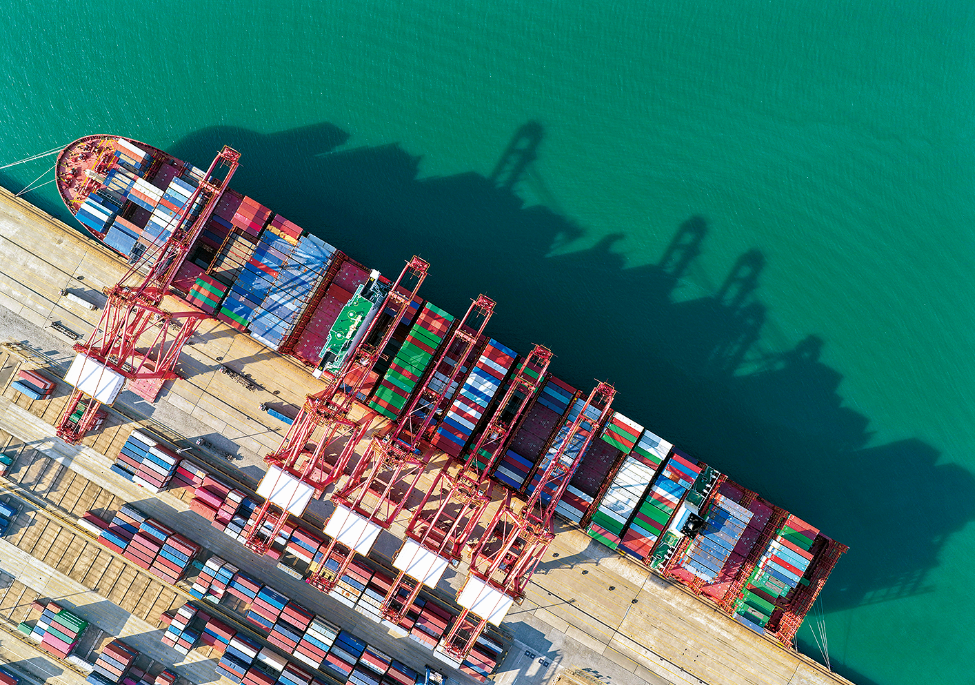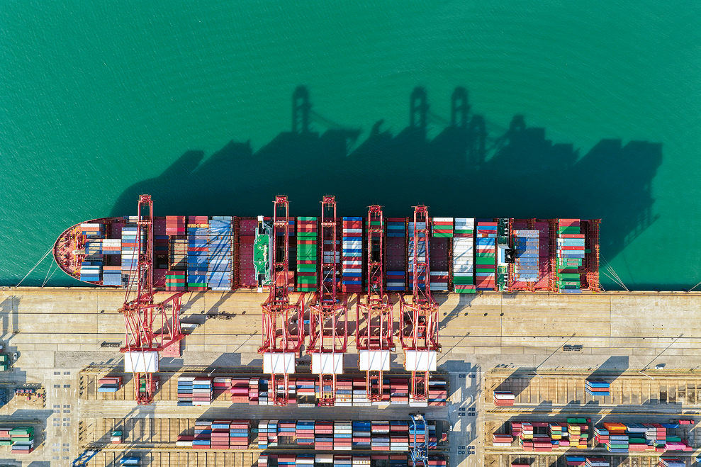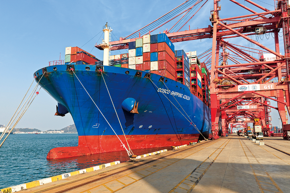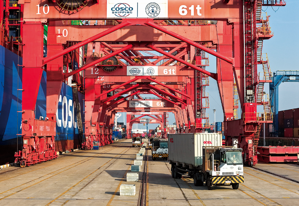近日,大型集装箱船舶“中远海运杜鹃”轮靠泊连云港港集装箱码头装卸货物。连云港港是中亚内陆国家重要出海港,近年来,连云港港围绕特色发展,提级扩能,为外贸进出口提供强有力支撑。