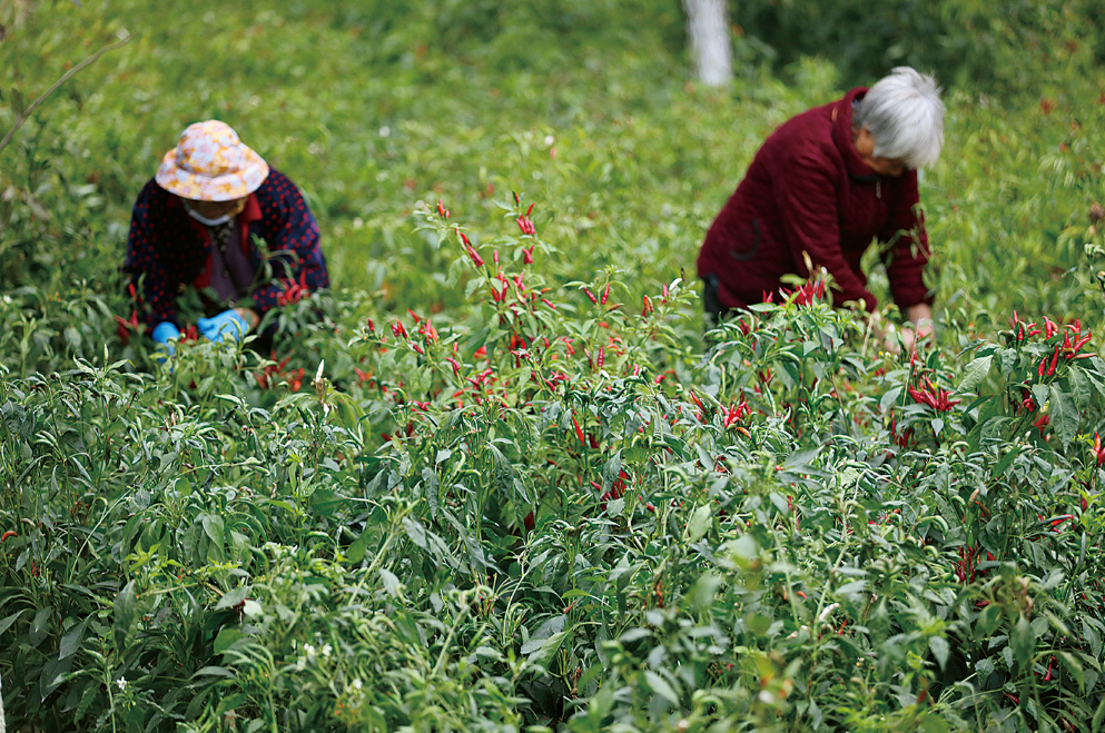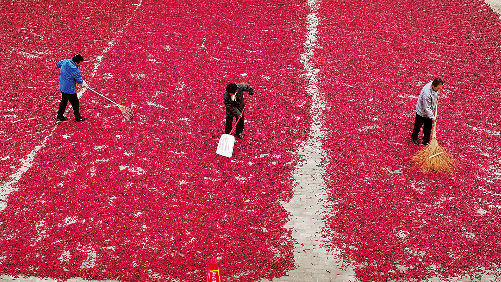 日前,灌云县侍庄街道孙荡村农民抢抓晴好天气,对辣椒进行采摘、晾晒,火红的辣椒红了大地。