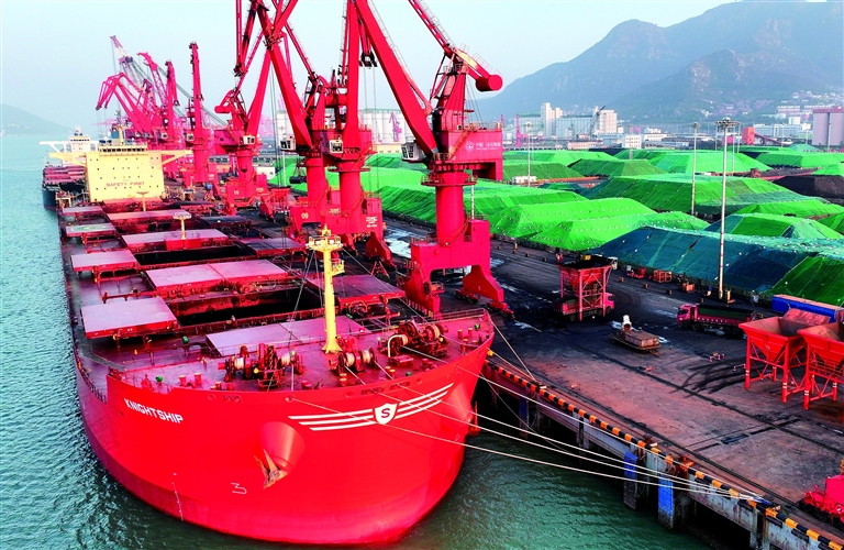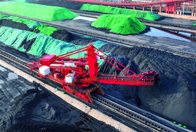 昨日,连云港港煤炭码头一派繁忙景象。随着冷空气来袭,港口提升电煤运输和储备能力,加快卸载和转运速度,实行24小时高效作业,促进电煤集疏运畅通,确保周边电厂发电用煤需求。(记者 王健民 摄)