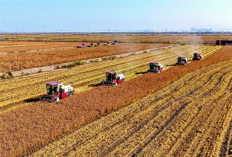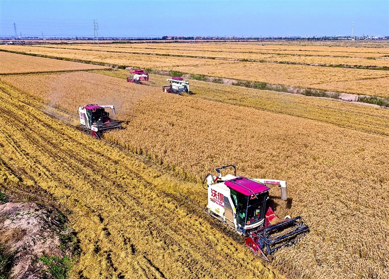 11月12日,收割机在市工投集团青口投资公司大新农场收割耐盐碱水稻。当前,大新农场耐盐碱水稻全面开镰收割。近年来,我市推进盐碱地综合利用,不断优化盐碱地土壤改良技术,昔日的百里盐田逐步成为如今独具特色的沿海粮仓。(记者 王健民 通讯员 王世超摄影报道)