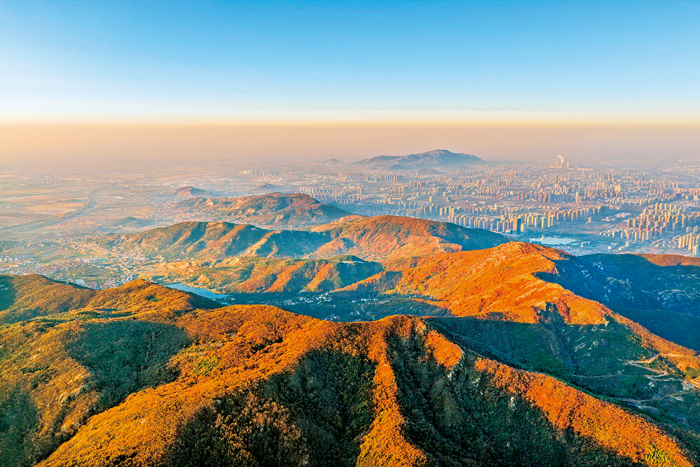 11月19日,晨曦中的花果山色彩斑斓。初冬时节,花果山层林尽染,宛如一幅天然画卷,美不胜收。