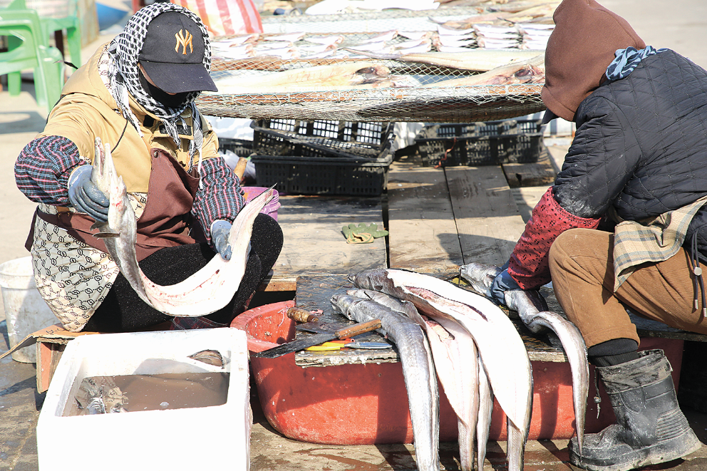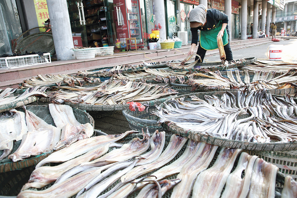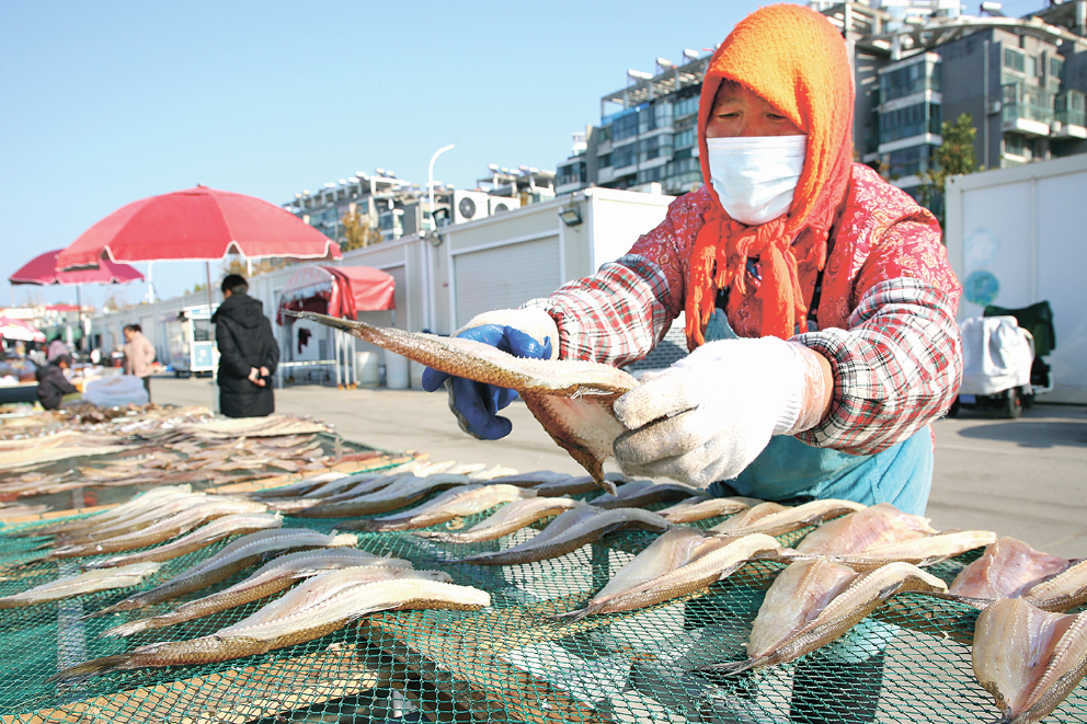 昨日,在连云区连岛街道西连岛村,渔民忙着加工晾晒鱼干。初冬时节,我市海洋渔业捕捞喜获丰收,渔民利用晴好天气,将捕获的刺鳗、鲳鱼、梭鱼、踏板鱼等海鱼进行腌制晾晒,制成传统风味鱼干供应市场,海岛处处呈现“晒丰收”景象。