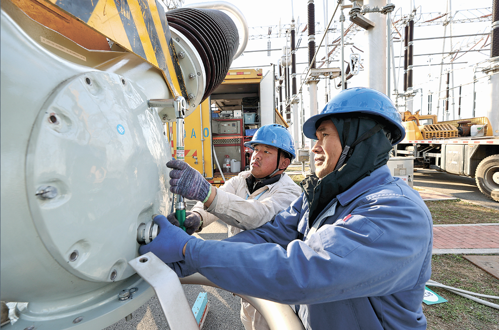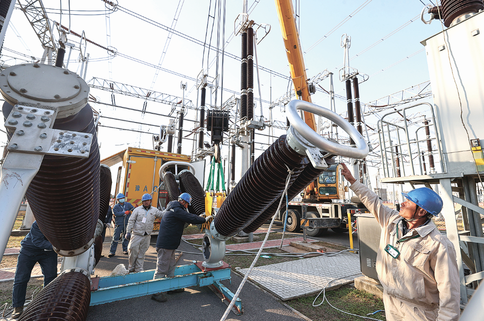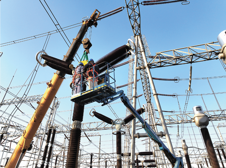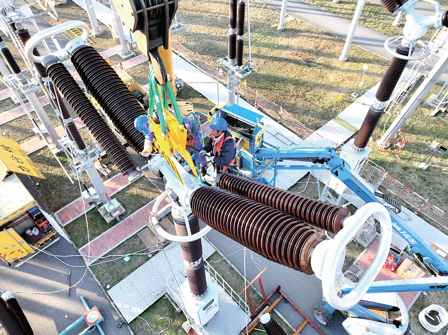 近日,国网连云港供电公司变电运检施工人员在500千伏艾塘变电站进行开关灭弧室更换吊装作业,确保设备处于良好状态,迎峰度冬保供电。