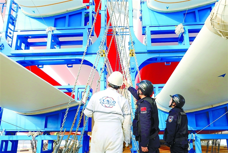 近日,利比里亚籍“顺福”轮装载7.5万余立方米的国产风电设备,从连云港港鸣笛启程前往南非。连云港边检站定制“一船一策”高效通关方案,最大限度压缩通关时间。据统计,今年前11个月,连云港口岸风电设备出口量193.57万立方米,同比增长66.18%。(记者 王健民 通讯员 王帅奇 张新语 摄影报道)