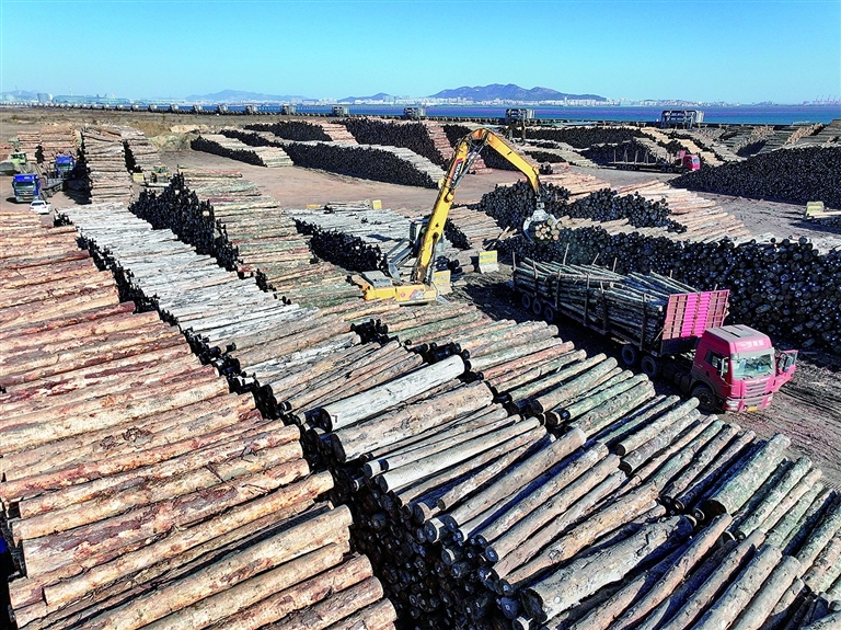 今年以来,赣榆港区货物吞吐量呈现明显增长势头,码头一派繁忙景象。图为日前,船舶在赣榆港区码头卸载进口木材。(记者 张泽瑞 通讯员 司伟 熊永军 王晓港 摄影报道)