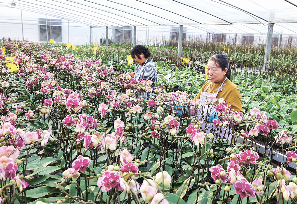 昨日,云台农场兴垦科技蝴蝶兰培育基地,工作人员正在管护蝴蝶兰。放眼望去,花床上的一株株蝴蝶兰苗根茎粗壮、叶片肥硕,催花室内近7万株蝴蝶兰竞相绽放。据悉,基地现有大小苗蝴蝶兰70万株,包含红蝴蝶、安娜、满天红等200多个品种。