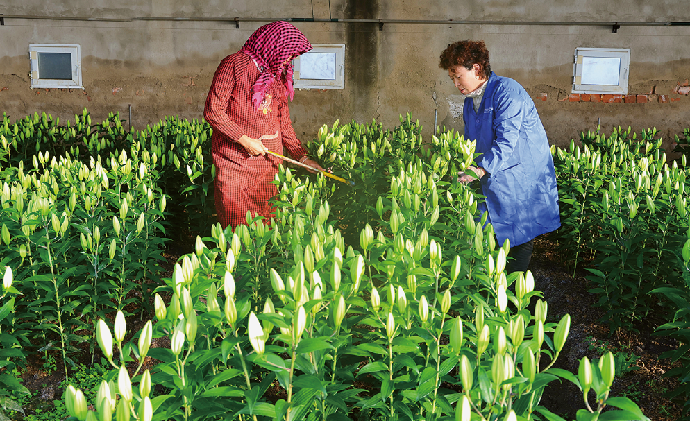 昨日,岗埠农场工作人员在花卉种植基地里挑选成熟的百合鲜切花,进行采收和包装作业,满足浙江金华等地的订单需求。 记者 牟进勇 通讯员 徐卫 摄影报道