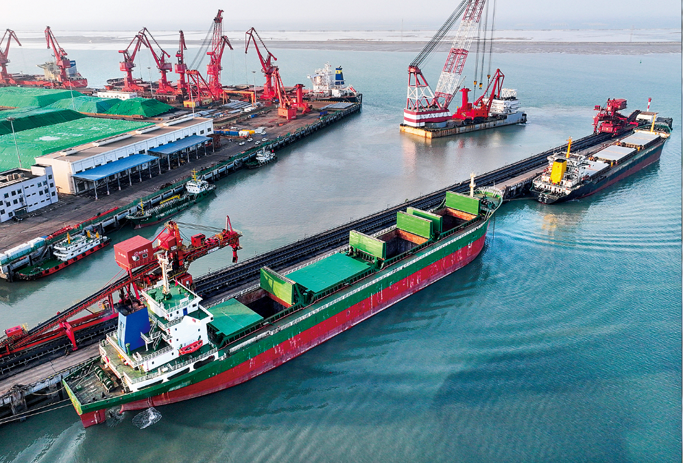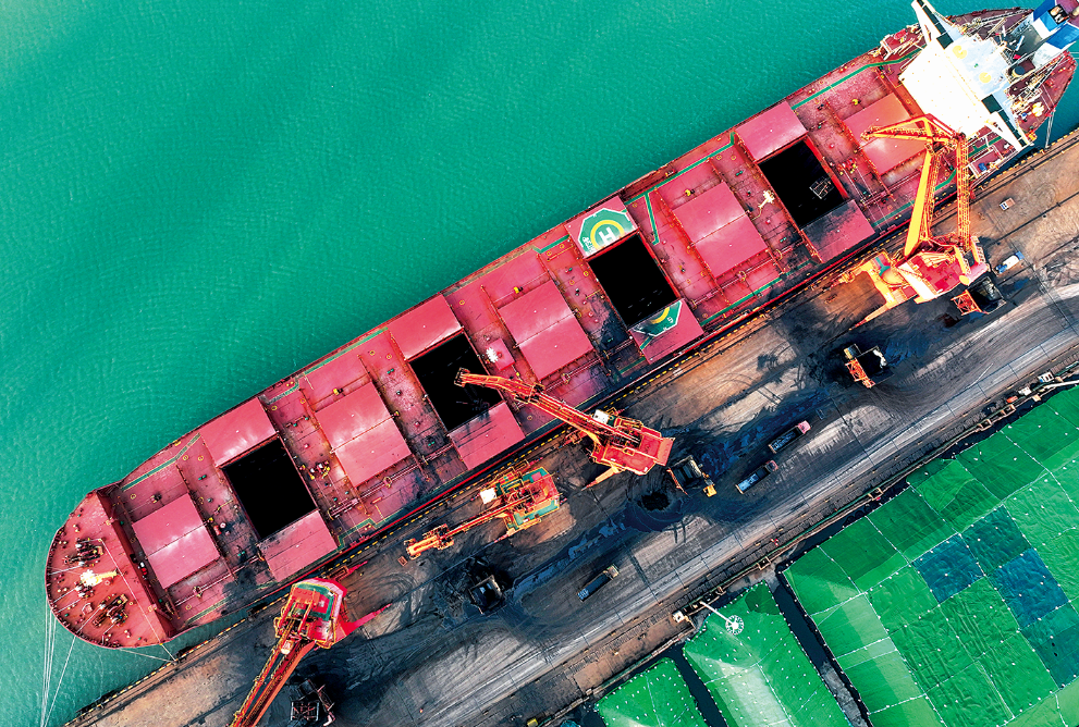 12月22日,在连云港港煤炭码头,货轮正在卸载电煤。随着冷空气袭来,连云港港提升电煤运输和储备能力,加快卸载和转运速度,实行24小时高效作业,促进电煤集疏运畅通,使电煤运输“零待港”,保障周边电厂发电用煤需求。