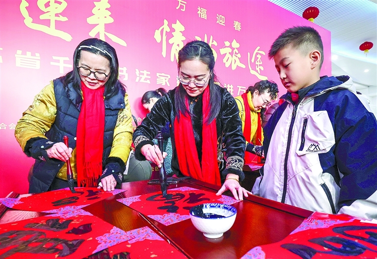 昨日,20多名书法爱好者在铁路连云港火车站为旅客义务写春联、福字,把新春祝福送给南来北往的旅客,为即将到来的春节增添了节日气氛。( 记者 王健民 通讯员 赵亮 摄影报道)