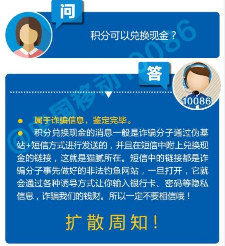 据媒体报道,此前有手机用户曾接到过骗子通过“伪基站”,假冒电信运营商发送的积分兑换短信。“您的积分超过2182,可兑换218.2元现金,请点击登录http://w***-10086m.com/。” “尊敬的用户:您的移动积分可兑换人民币××元,请登录:http://10086app**.com兑换领取,逾期不予兑换!”