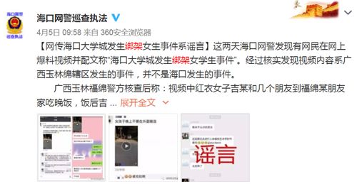 海南省海口市警方“@海口网警巡查执法”近日也通过微博发布了辟谣声明,表示“海口大学城发生绑架女学生事件”为谣言。经过警方核实,网传视频的内容系广西玉林绵辖区发生的事件,并不是海口发生的事件。