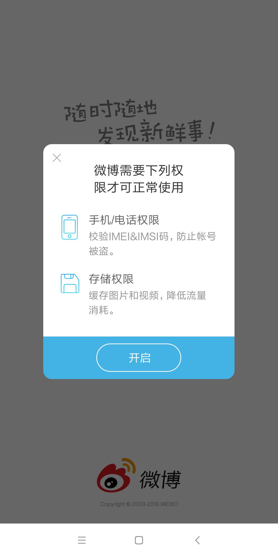 新浪微博,也要求手机电话权限、存储权限这两项必需开启,否则应用无法使用。对此,微博相关服务条款解释为“校验IMEI&IMSI码,防止账号被盗”以及“缓存图片和视频,降低流量消耗”。