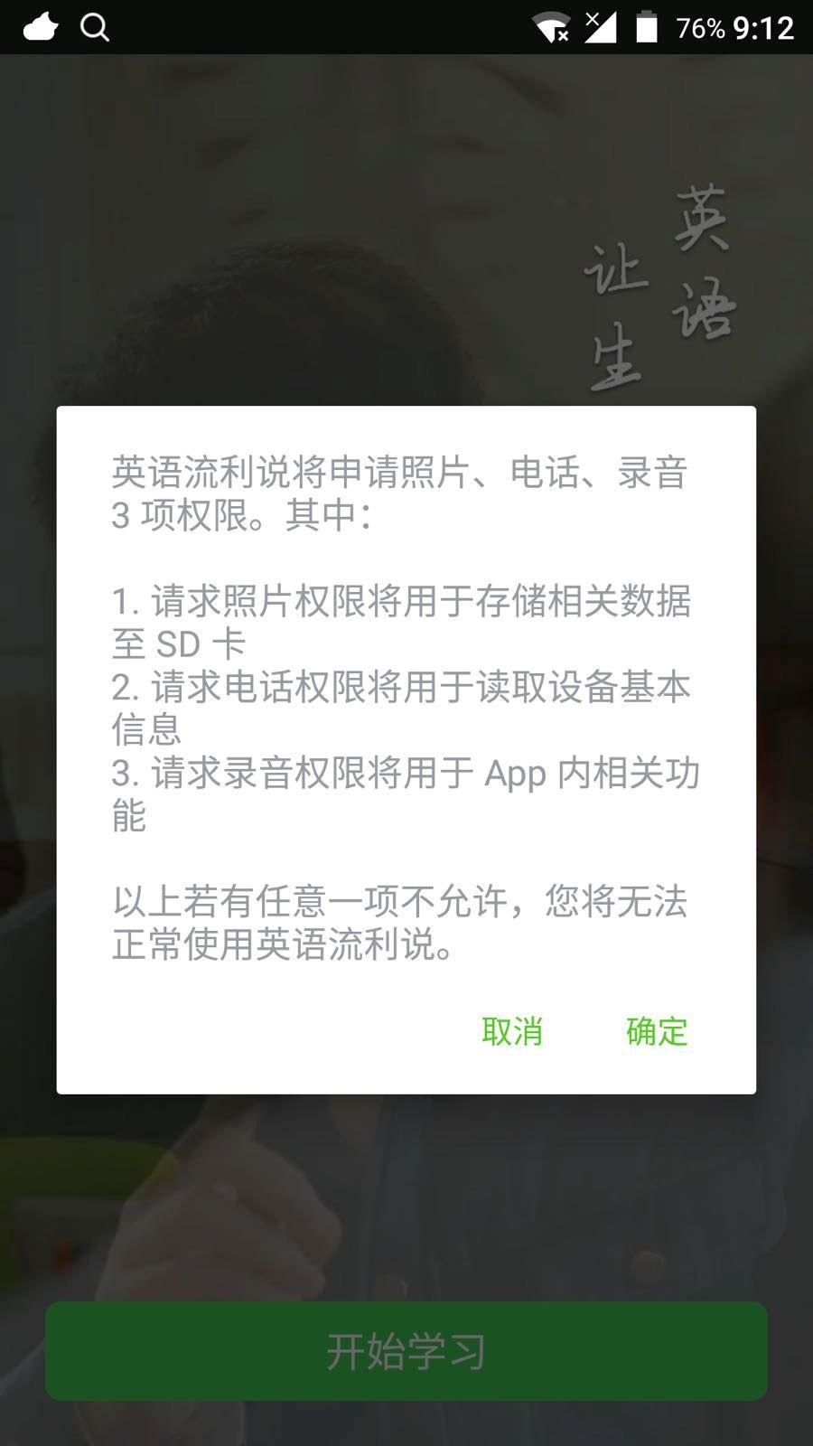 英语流利说在安装时,提示不需要任何特殊权限,实际使用时需要照片、电话、录音三项权限,以上若有任意一项不允许,将无法正常使用应用。用户选择“拒绝”后,应用直接自动关闭。