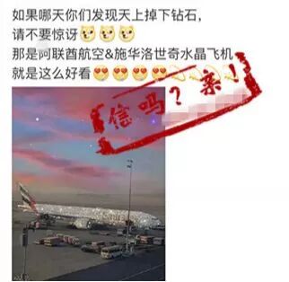 谣言:近日,一张镶满水晶的客机照片在网上刷屏,发布者称,这是阿联酋航空和施华洛世奇合作推出的水晶飞机。
