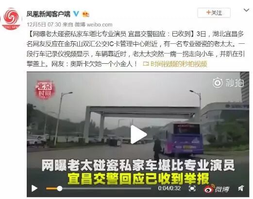 谣言:12月3日,一段题为“专业碰瓷老太太”的视频在网上流传,视频中,一老年人身体突然失去平衡,颤颤巍巍走了多步,最终扶在了汽车引擎盖上。