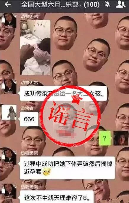 谣言:网民“动物无常”在微信群内炫耀,自己成功将艾滋病传染给一名大二女生。