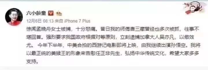 谣言:12月6日,六小龄童就“孟晚舟被捕事件”发布评论,并强烈要求中国警方立即逮捕加拿大人吴亦凡。
