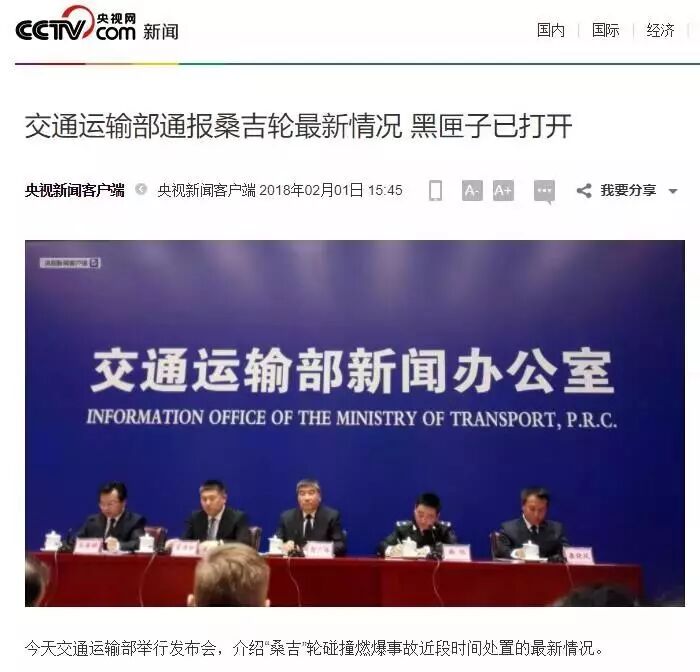 ➋其次,谣言中使用的发布会图片是盗用了交通运输部介绍“桑吉”轮碰撞燃爆事故应急处置和救援工作情况发布会的照片。