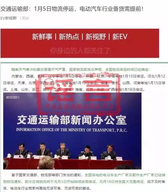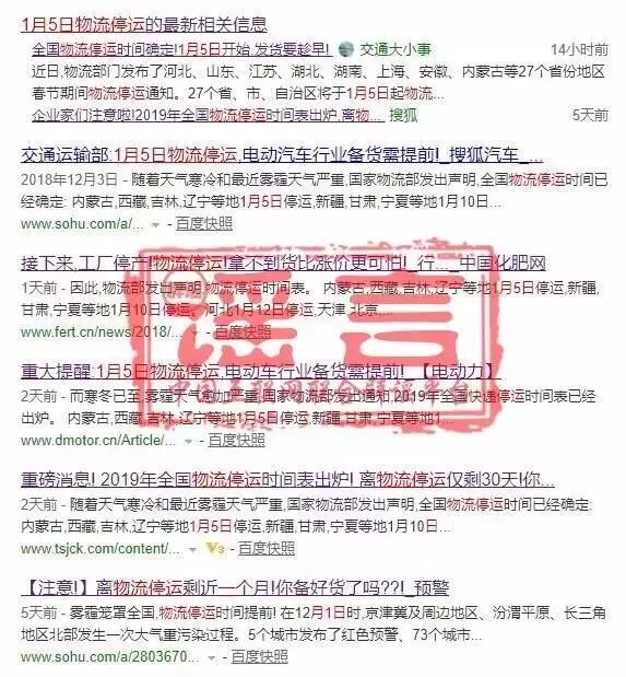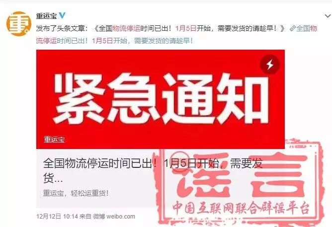 【连网】近日,网上出现了“1月5日物流停运”等相关传言,中国互联网联合辟谣平台向交通运输部求证,此为谣言!