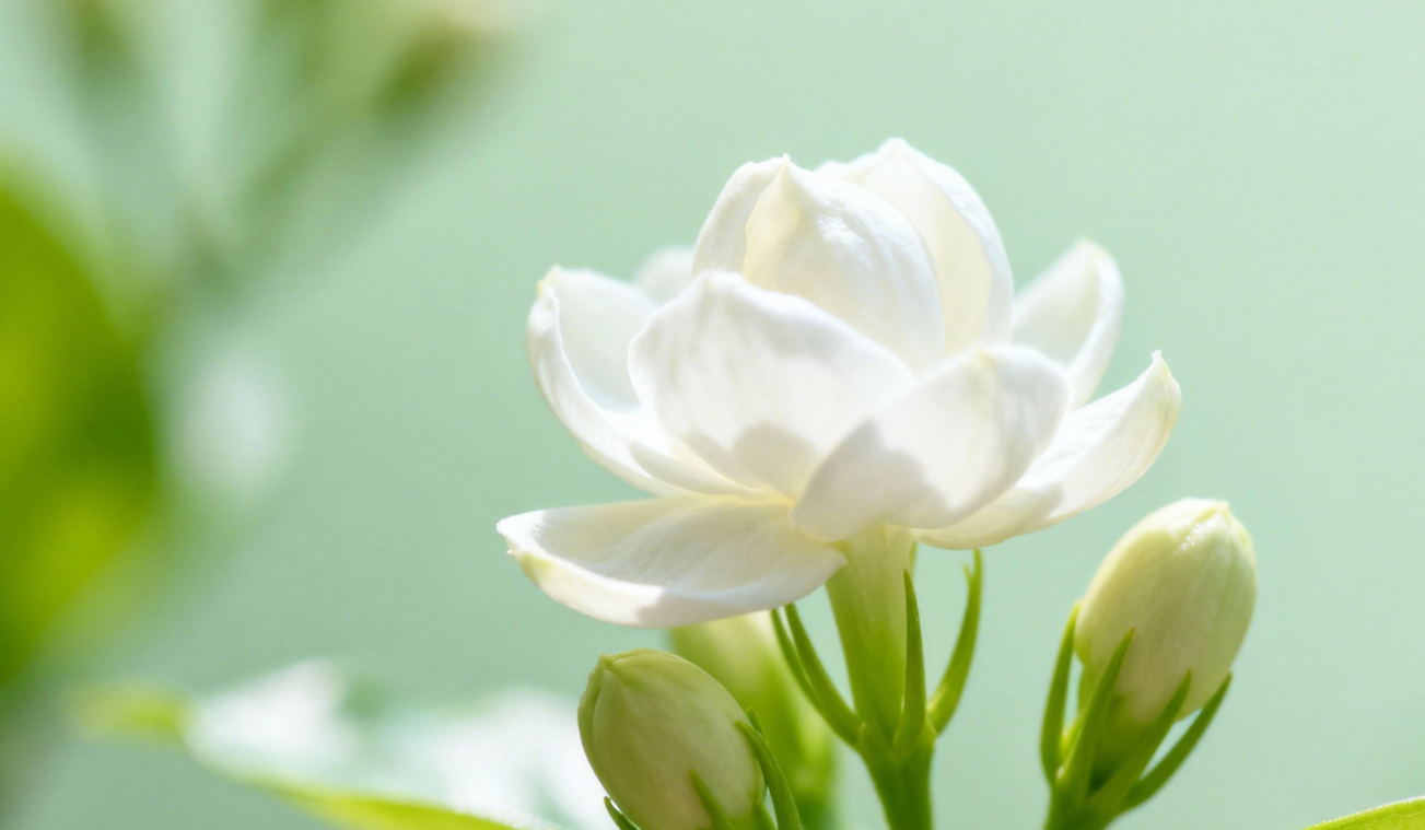 茉莉,不似月季明媚,没有牡丹富贵,深绿椭圆小叶、低矮的株型,在百花园中深藏角落,不争繁华、不畏秋霜。每逢初夏,茉莉花绽放,她那清丽脱俗的品性、馥郁悠长的香气,冰晶胜雪、人见犹怜形态,赢得众口称赞。宋人许棣以“雪缀柔枝冷未融”刻画其盛夏绽放的清冷意境。其香气被誉为“人间第一香”。茉莉花茶也是深受百姓喜爱的饮品。茶馆小二扯着嗓子喊:“茉莉花(茶)来喽!”忙碌了一天,抓一把茉莉花高沫,冲上滚烫的开水,茶香四溢,啜上一口败火解渴,那叫一个舒坦。