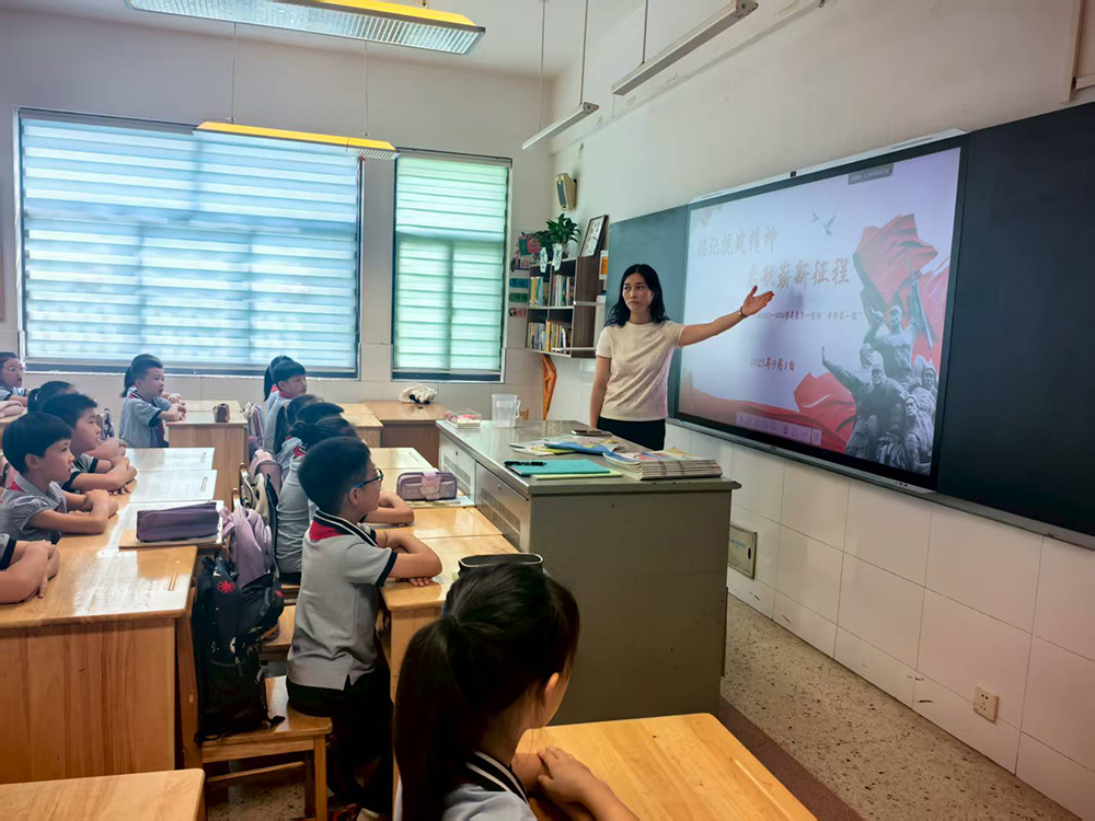 学校党总支书记章建华给大家带来新学期的第一课,他带领大家回顾了这段难以忘却的历史,跟同学们强调了伟大抗战精神的内涵。八十年前,革命先辈们用生命守护国家的和平,八十年后,这份沉甸甸的责任落到我们每一个人肩上。章书记寄语同学们要立志向,树立为民族复兴而读书的远大理想;要修品行,做