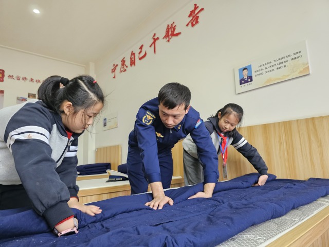 在生活区参观时,消防员宿舍里棱角分明的“豆腐块”被子让小记者们惊叹不已。在消防叔叔的示范指导下,大家跃跃欲试地动手学习叠被子,从铺平床单到折叠边角,一步步模仿操作,虽然动作略显生疏,但都学得格外认真。有同学忍不住说道:“原来叠被子也有这么多技巧,消防叔叔太厉害了,我回家也要这样叠被子!”