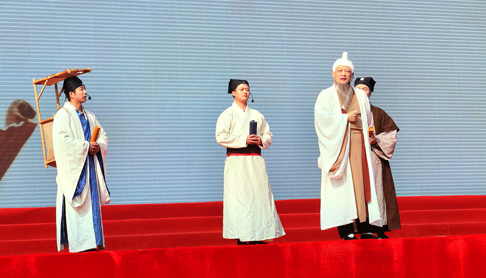 《文明曙光》篇章中,情景剧《曙光・问道》重现孔子在孔望山观海讲学的场景,子路、子贡等弟子与孔子的对话,生动诠释“有教无类”的教育初心;60名学生身着古装组成书简方阵,合诵“子曰:有教无类……”,古声古意间让传统文化焕发新生。