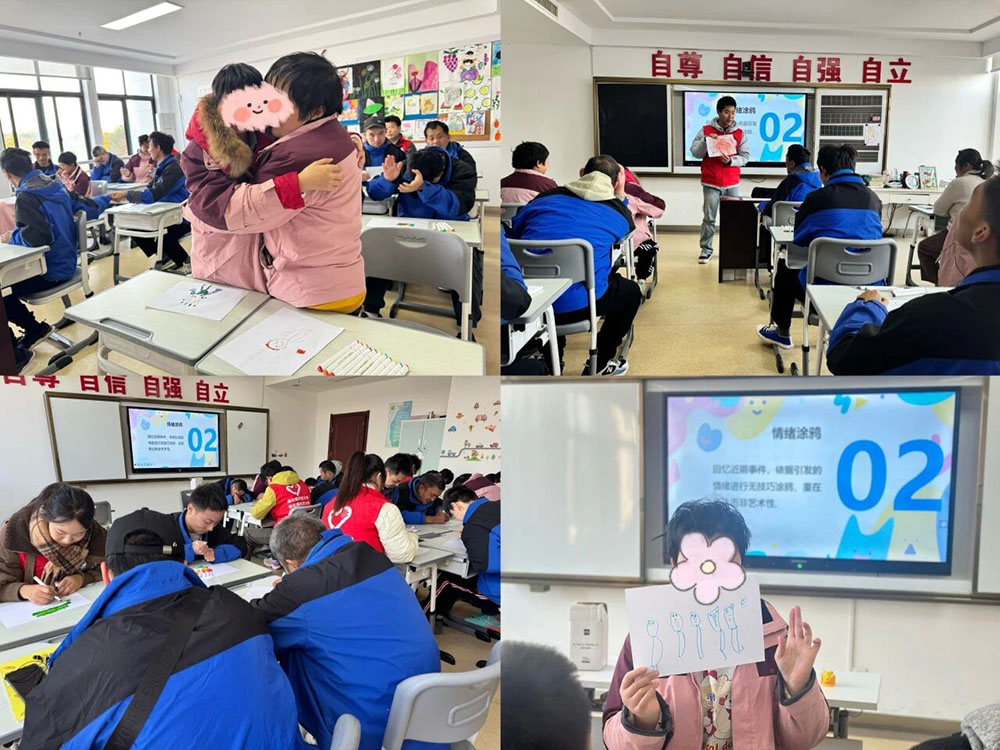随后,连云港开放大学向连云港市残疾人托养服务中心捐赠100条秋冬加厚全棉磨毛床单、100个丝绵枕头及100个配套枕头套,物资价值逾万元,为残疾人朋友温暖过冬筑牢保障。捐赠仪式后,学校心理志愿者和残疾人学员开展了“我的情绪我表达”趣味活动。活动以《幸福拍手歌》破冰暖场,学员们跟随欢快旋律尽情律动,在轻松模仿中打破隔阂,快速融入欢乐氛围。“寻找丢失的情绪”环节,参与者在不同情景下,帮助小兔子找回丢失的情绪,大家纷纷上台通过表情与动作演绎开心、生气等情绪,现场掌声阵阵,大家在互动中提升情绪识别能力,同时掌握了各种情绪对应的不同颜色;“情绪涂鸦”环节,大家手持彩色画笔,将近期的心情与感受通过绘画尽情释放,部分参与者主动分享作品背后的故事,得到大家的积极回应与鼓励;“情绪调节小妙招分享”环节,心理健康专职教师薛旭旭、赵文倩讲解释放情绪的小妙招,带领大家体验身体伸展放松法、深呼吸放松法、积极自我暗示等实用技巧,同时邀请大家分享自身情绪调节经验,如唱歌、画画、散步等,实现双向交流学习。