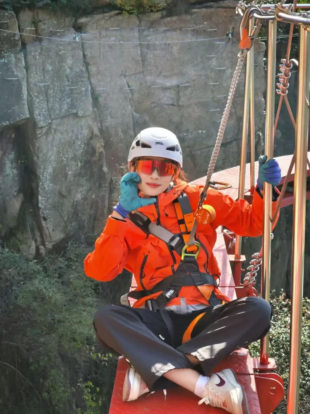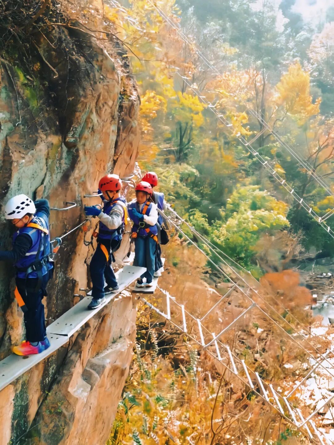 最惊艳的莫过于岩壁上的“流动风景”——飞拉达的挑战者们系着安全绳,在彩林环抱的悬崖上缓缓前行。550米“趣玩线”上,亲子家庭坐在网红空中坐椅,将脚下层林尽染的山谷纳入镜头,笑声随秋风飘散;