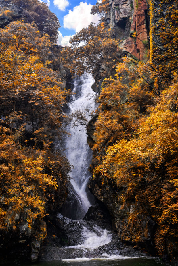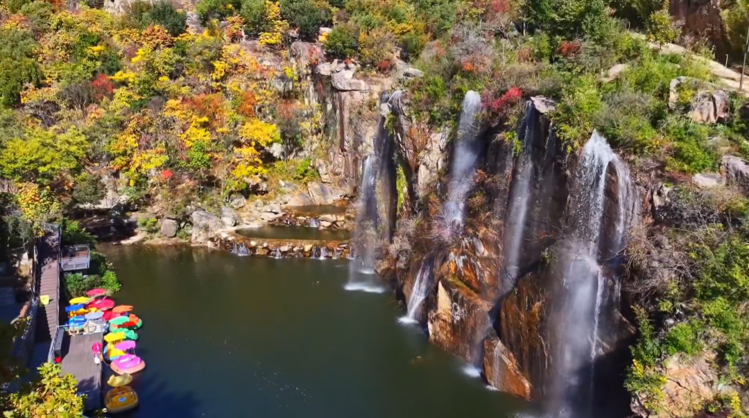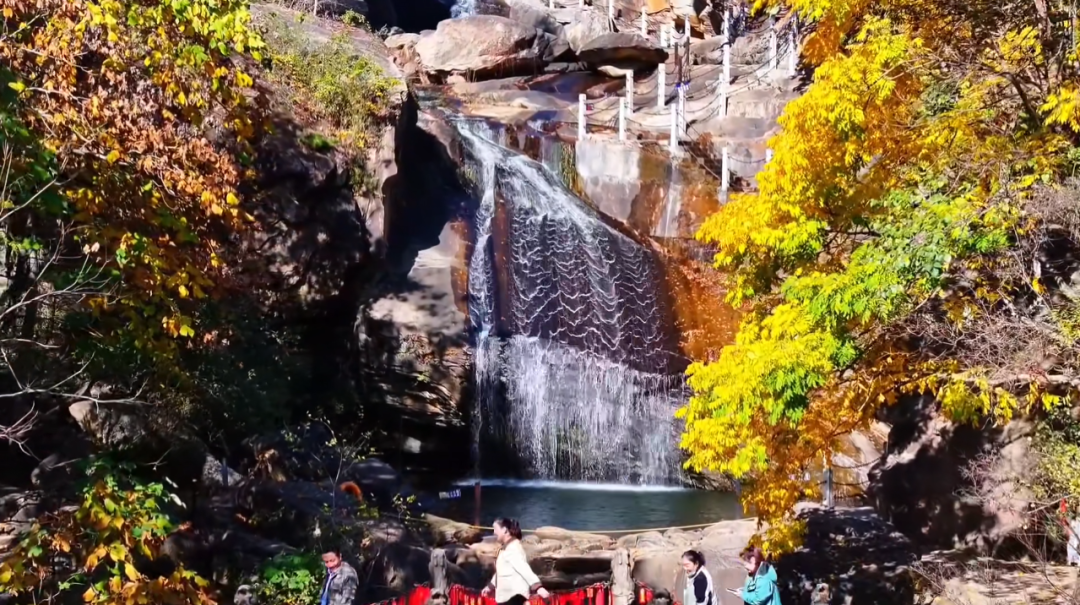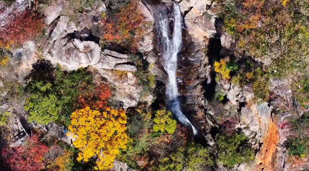 镜头下的瀑布群,是这场秋景大片的灵魂注脚。37.5米的老龙潭瀑布如白龙跃涧,银练垂落间溅起的水雾,在秋阳下织就七彩霓虹,与两岸红枫、黄栌相映,成了航拍画面里震撼的亮色。