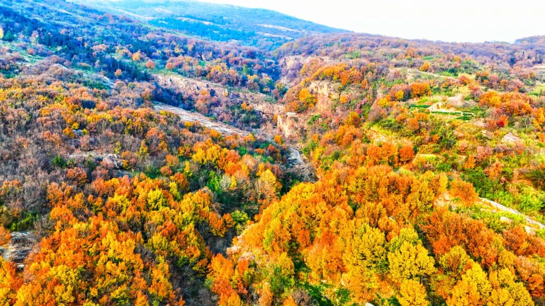 当无人机挣脱地心引力,云台南麓山脉的秋意便以磅礴的姿态铺展开来——漫山林木褪去夏的葱茏,被秋阳点染成赤橙黄绿的斑斓色谱,从谷底到山巅层层晕染,像大自然挥毫泼墨的写意长卷。